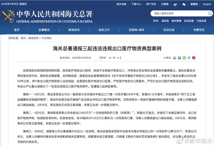 醫療物資違法違規出口?海關從嚴從重從速處罰!-新華網