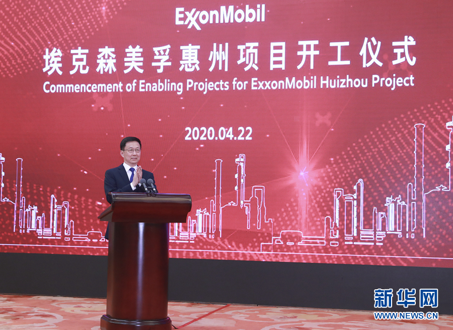 4月22日,埃克森美孚在粵港澳大灣區(qū)投資建設(shè)的廣東惠州乙烯項(xiàng)目舉行“云開工”儀式。中共中央政治局常委、國務(wù)院副總理韓正出席并宣布項(xiàng)目開工。 新華社記者 丁林 攝