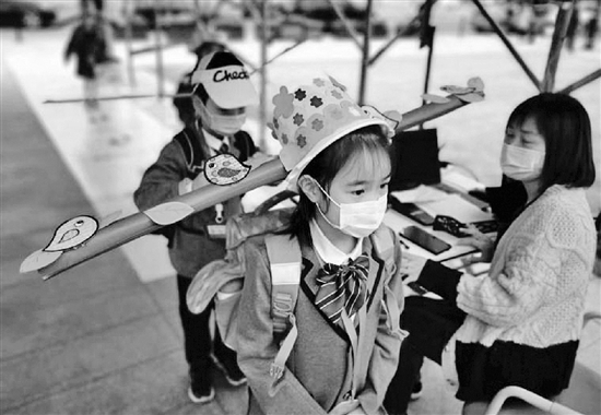 昨天上午8點,杭州養正小學終于迎來了小主人們,排隊、測溫、刷卡、消毒……特殊情況下,孩子們要通過重重關卡才能夠進入學校。此時從校門口經過的路人們,發現這些萌娃有點特殊,除了佩戴防疫用的口罩,他們的頭上還戴著各式各樣的帽子,每一頂都很長很長。