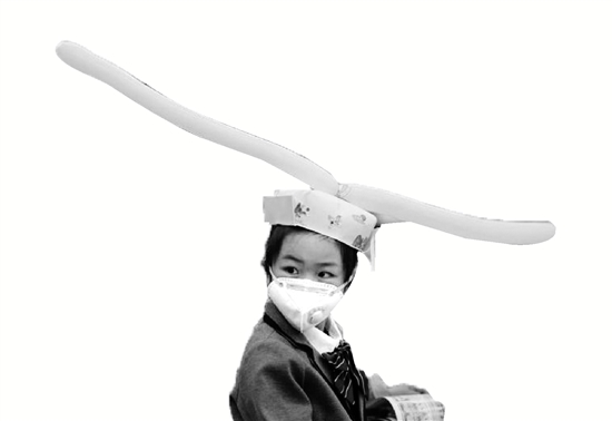 有的是在帽頂上粘了兩只棍子狀的氣球,從左右兩邊長長地伸了出去;有的是把動畫片《超級飛俠》的主角,一架叫“樂迪”的飛機戴在了頭上當帽子,兩側機翼展開,剛好一米長;還有的帽子左邊一只長頸鹿,右邊一只大象,脖子長加上鼻子長,也夠一米了;更多娃的帽子,像極了宋朝的官帽。