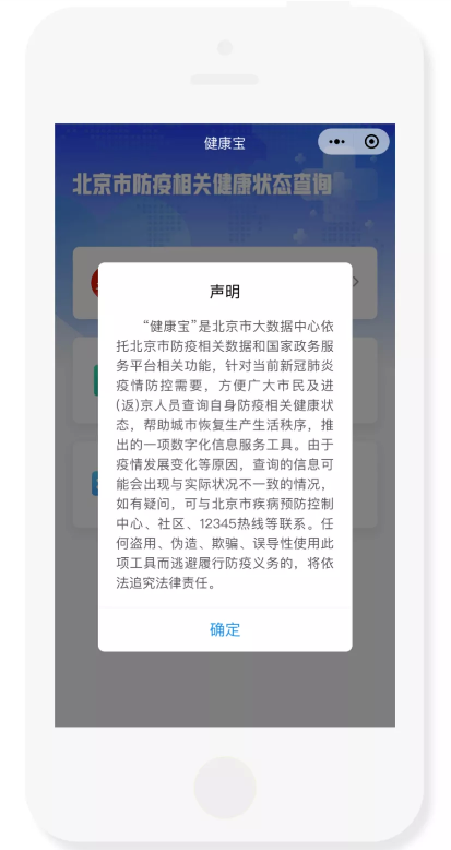 “健康寶”是北京市大數據中心依托北京市防疫相關數據和國家政務服務平臺相關功能,針對當前新冠肺炎疫情防控需要,方便廣大市民及進(返)京人員查詢自身防疫相關健康狀態,幫助城市恢復生產生活秩序,推出的一項數字化信息服務工具。