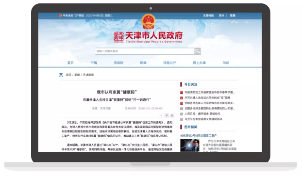 京冀來津人員通過“津心辦”APP、“津心辦”支付寶小程序、“津心辦”微信小程序申領天津“健康碼”,享受同城待遇,并依托全國一體化政務服務平臺,通過跨地區防疫健康信息數據共享,實現京津冀“健康碼”信息互認,生成天津“健康碼”,憑碼出行。