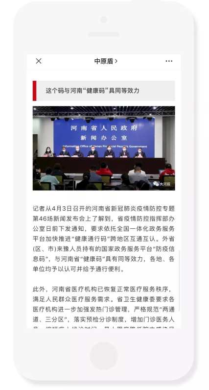 河南省依托全國一體化政務服務平臺加快推進“健康通行碼”跨地區互通互認。外省(區、市)來豫人員持有的國家政務服務平臺“防疫信息碼”,與河南省“健康碼”具有同等效力,各地、各單位均予以認可并給予通行便利。