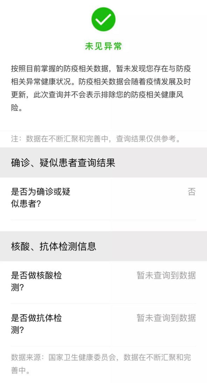 此外,核酸和抗體檢測結(jié)果信息還納入了全國一體化平臺(tái)“防疫健康信息碼”服務(wù)。用戶可通過國家政務(wù)服務(wù)平臺(tái)微信、支付寶、百度小程序,根據(jù)操作指引申領(lǐng)國家平臺(tái)的“防疫健康信息碼”,“防疫健康信息碼”會(huì)如實(shí)反映本人7天內(nèi)核酸及抗體檢測結(jié)果。如核酸檢測結(jié)果為陰性,則防疫健康風(fēng)險(xiǎn)狀態(tài)顯示“未見異?!?。如核酸檢測結(jié)果為陽性,則會(huì)出現(xiàn)“核酸檢測結(jié)果為陽性”的出行提示。如果7天內(nèi)未做過核酸及抗體檢測,防疫健康信息會(huì)根據(jù)個(gè)人當(dāng)前提供的相關(guān)數(shù)據(jù)顯示健康風(fēng)險(xiǎn)結(jié)果。