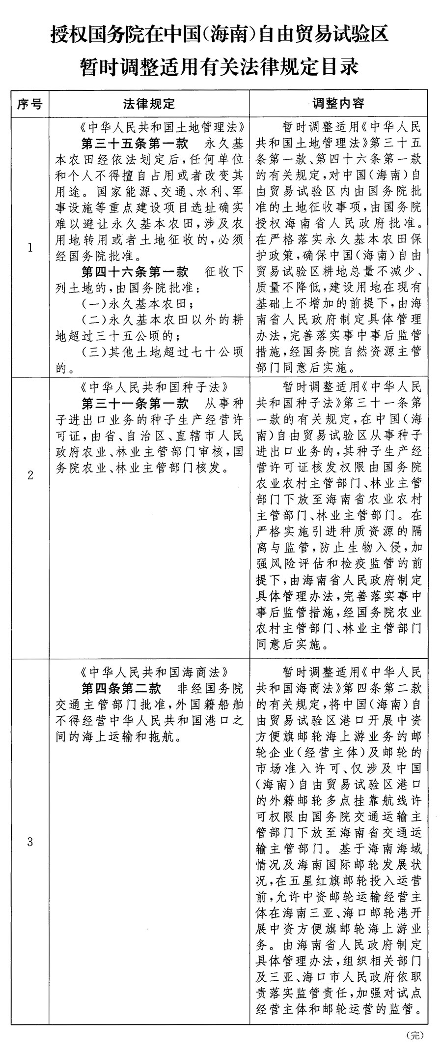 為支持海南全面深化改革開放,推動中國(海南)自由貿易試驗區試點政策落地,第十三屆全國人民代表大會常務委員會第十七次會議決定:授權國務院在中國(海南)自由貿易試驗區暫時調整適用《中華人民共和國土地管理法》《中華人民共和國種子法》《中華人民共和國海商法》的有關規定(目錄附后),暫時調整適用的期限至2024年12月31日。暫時調整適用有關法律規定,必須建立健全事中事后監管制度,有效防控風險,國務院及其有關部門要加強指導、協調和監督,及時總結試點工作經驗,并就暫時調整適用有關法律規定的情況向全國人民代表大會常務委員會作出中期報告。對實踐證明可行的,修改完善有關法律;對實踐證明不宜調整的,恢復施行有關法律規定。