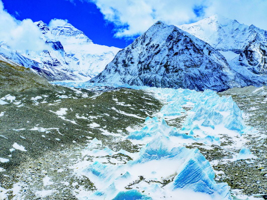 位于珠穆朗瑪峰腳下海拔5400米左右的中絨布冰川(4月30日攝,無人機照片)。普布扎西攝