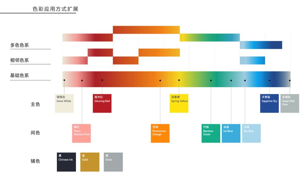色彩系統包括主色、間色、輔助色三部分。主色包括霞光紅、迎春黃、天霽藍、長城灰、瑞雪白: