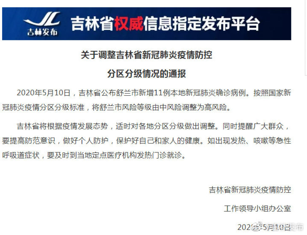 【關(guān)于調(diào)整吉林省新冠肺炎疫情防控分區(qū)分級(jí)情況的通報(bào)】2020年5月10日,吉林省公布舒蘭市新增11例本地新冠肺炎確診病例。按照國(guó)家新冠肺炎疫情分區(qū)分級(jí)標(biāo)準(zhǔn),將舒蘭市風(fēng)險(xiǎn)等級(jí)由中風(fēng)險(xiǎn)調(diào)整為高風(fēng)險(xiǎn)。