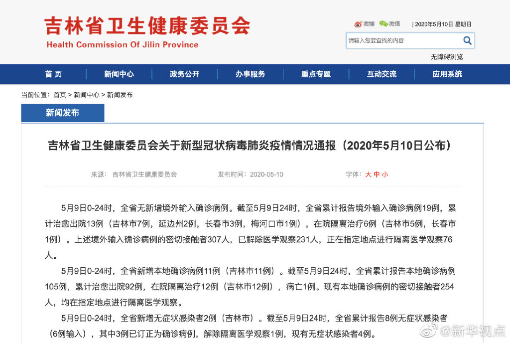 5月9日0-24時,全省新增本地確診病例11例(吉林市11例)。截至5月9日24時,全省累計報告本地確診病例105例,累計治愈出院92例,在院隔離治療12例(吉林市12例),病亡1例。現有本地確診病例的密切接觸者254人,均在指定地點進行隔離醫學觀察。