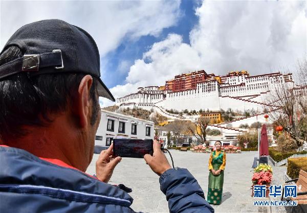 3月1日,布達拉宮管理處講解員次仁卓嘎(右)在進行直播。 新華社記者 春拉 攝