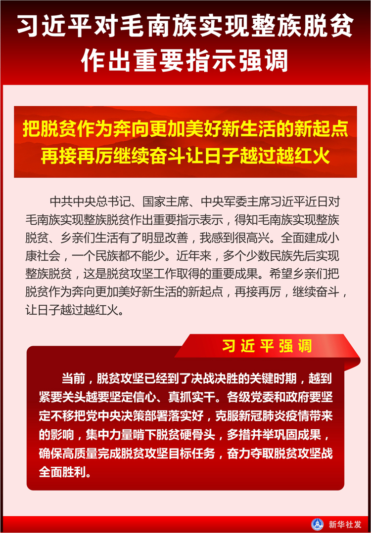 新華社北京5月20日電? 中共中央總書記、國家主席、中央軍委主席習近平近日對毛南族實現整族脫貧作出重要指示表示,得知毛南族實現整族脫貧、鄉親們生活有了明顯改善,我感到很高興。全面建成小康社會,一個民族都不能少。近年來,多個少數民族先后實現整族脫貧,這是脫貧攻堅工作取得的重要成果。希望鄉親們把脫貧作為奔向更加美好新生活的新起點,再接再厲,繼續奮斗,讓日子越過越紅火。