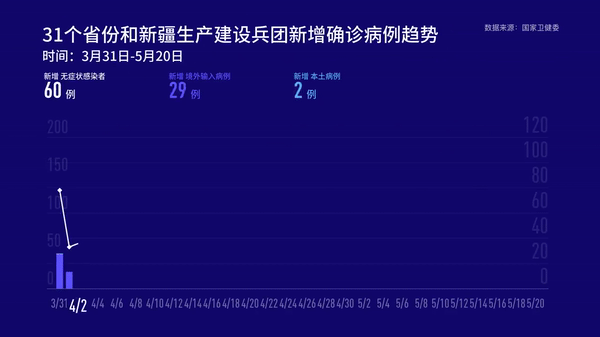 5月20日0—24時,31個省(自治區、直轄市)和新疆生產建設兵團報告新增確診病例2例,其中境外輸入病例1例(在廣東),本土病例1例(在上海);無新增死亡病例;新增疑似病例1例,為境外輸入病例(在上海)。