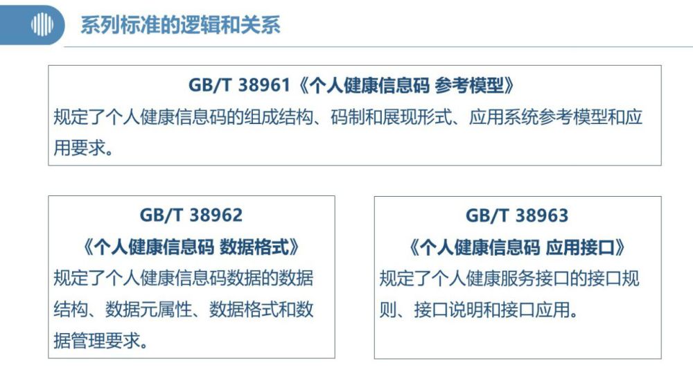 據了解,健康碼“國標”由《參考模型》《數據格式》和《應用接口》三項標準構成。總體上來看,《參考模型》是框架性標準,重在提出“健康碼”應用系統和系統間互認的技術模型;《數據格式》規范了個人健康信息數據,重點在數據“原料”層面下功夫;《應用接口》則可看作是框架模型下實現系統對接互認的操作指導手冊。三項標準互為支撐和補充,共同適用于指導“健康碼”系統的設計、開發和系統集成。