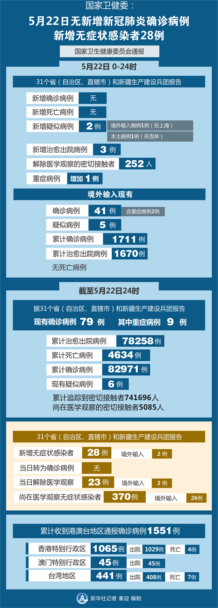 截至5月22日24時(shí),據(jù)31個(gè)省(自治區(qū)、直轄市)和新疆生產(chǎn)建設(shè)兵團(tuán)報(bào)告,現(xiàn)有確診病例79例(其中重癥病例9例),累計(jì)治愈出院病例78258例,累計(jì)死亡病例4634例,累計(jì)報(bào)告確診病例82971例,現(xiàn)有疑似病例6例。累計(jì)追蹤到密切接觸者741696人,尚在醫(yī)學(xué)觀察的密切接觸者5085人。