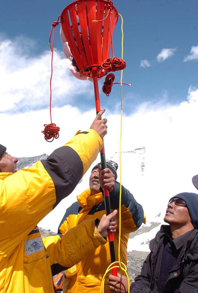 2005年5月19日,珠峰高程測量登山隊員再次在海拔6500米的前進營地學習測量儀器的安裝固定方法。新華社記者索朗羅布攝