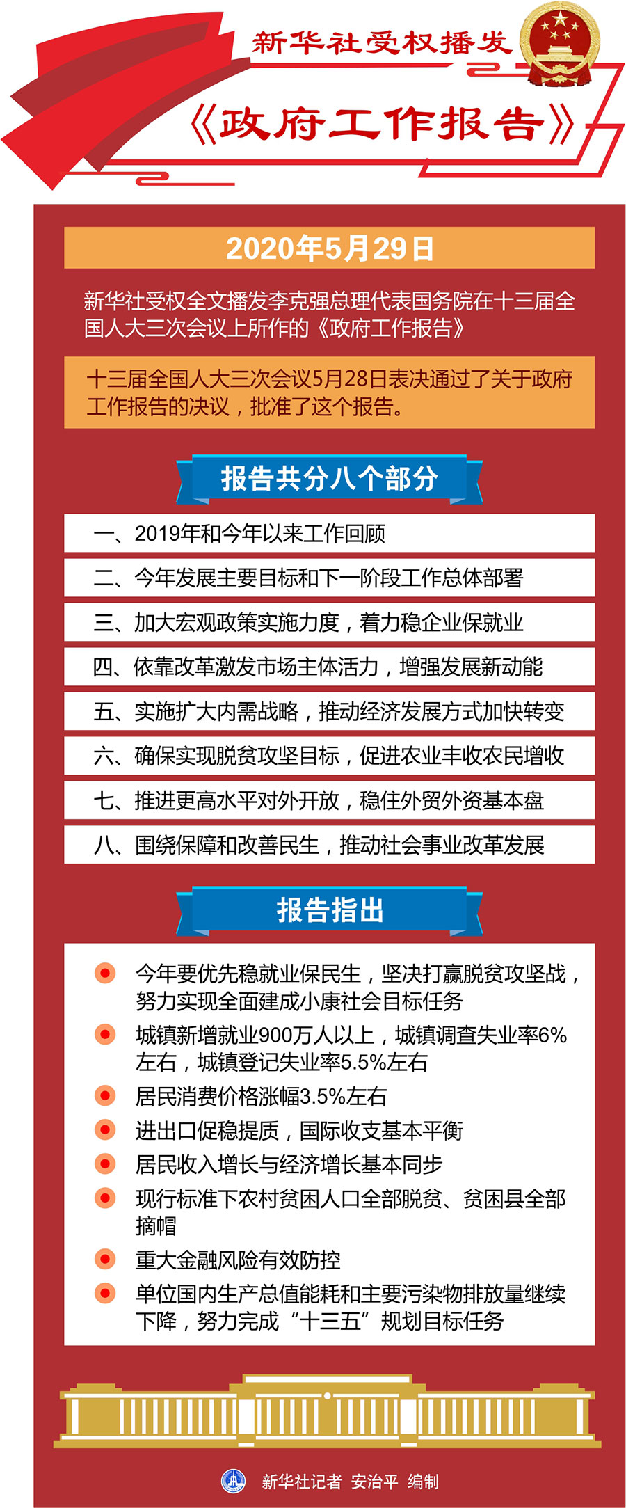 新華社北京5月29日電 新華社受權于29日全文播發李克強總理代表國務院在十三屆全國人大三次會議上所作的《政府工作報告》。十三屆全國人大三次會議5月28日表決通過了關于政府工作報告的決議,批準了這個報告。