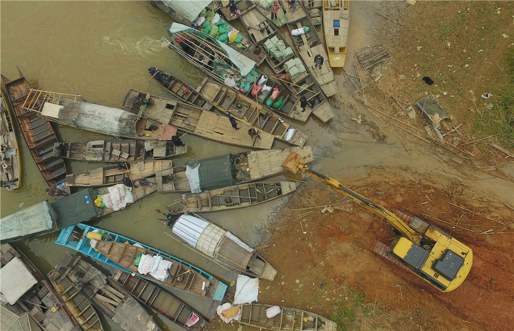 在湖南常德漢壽縣蔣家嘴鎮,工作人員在洞庭湖邊駕駛挖掘機回收漁船(2019年12月17日攝,無人機照片)。新華社記者 薛宇舸 攝