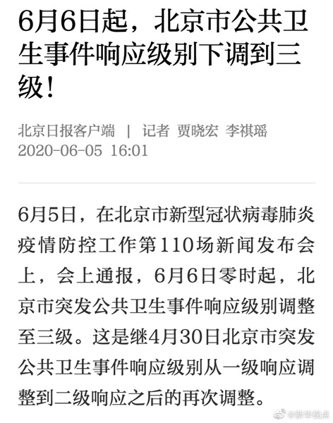 6月5日,在北京市新型冠狀病毒肺炎疫情防控工作第110場新聞發布會上,會上通報,6月6日零時起,北京市突發公共衛生事件響應級別調整至三級。這是繼4月30日北京市突發公共衛生事件響應級別從一級響應調整到二級響應之后的再次調整。?