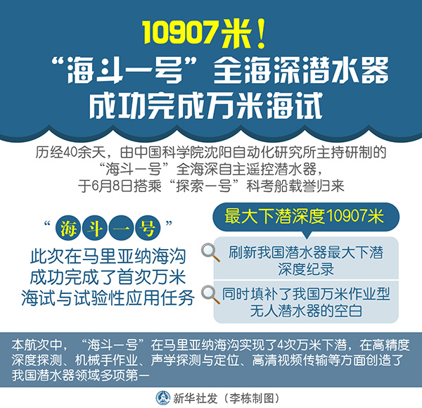 “海斗一號(hào)”此次在馬里亞納海溝成功完成了首次萬(wàn)米海試與試驗(yàn)性應(yīng)用任務(wù),最大下潛深度10907米,刷新我國(guó)潛水器最大下潛深度紀(jì)錄,同時(shí)填補(bǔ)了我國(guó)萬(wàn)米作業(yè)型無(wú)人潛水器的空白。