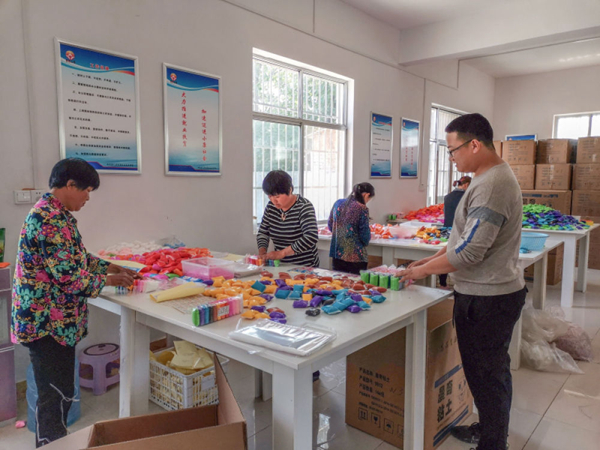 山東省濟南市平陰縣返鄉(xiāng)創(chuàng)業(yè)青年宋京偉(右一)帶領村民在公司車間分裝太空泥