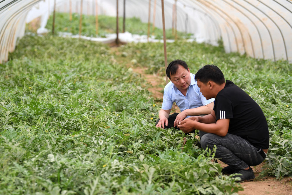 ?鄭加衛(左)在汪李村的一家瓜果種植基地里走訪。