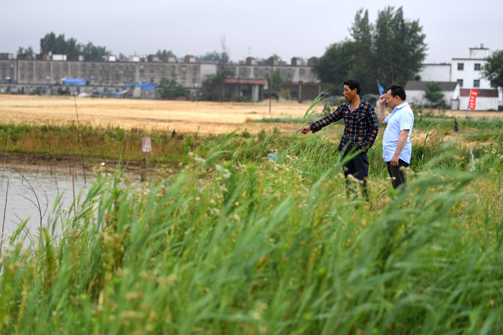 ?鄭加衛(右)在了解汪李村貧困戶的魚塘養殖情況。