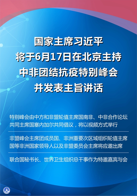 特別峰會(huì)由中方和非盟輪值主席國(guó)南非、中非合作論壇共同主席國(guó)塞內(nèi)加爾共同倡議,將以視頻方式舉行。非盟峰會(huì)主席團(tuán)成員國(guó)、非洲重要次區(qū)域組織輪值主席國(guó)等非洲國(guó)家領(lǐng)導(dǎo)人以及非盟委員會(huì)主席將應(yīng)邀出席。聯(lián)合國(guó)秘書(shū)長(zhǎng)、世界衛(wèi)生組織總干事作為特邀嘉賓與會(huì)。