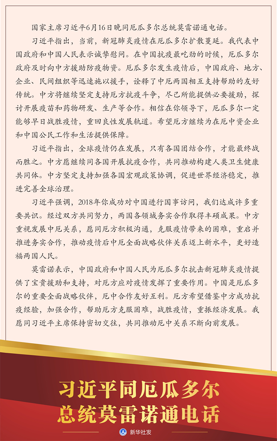 新華社北京6月16日電? 國家主席習(xí)近平6月16日晚同厄瓜多爾總統(tǒng)莫雷諾通電話。
