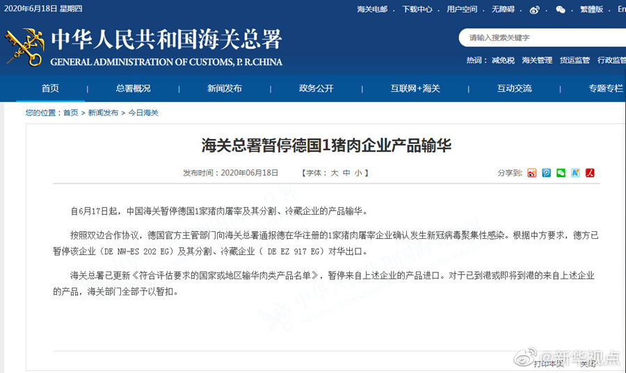 海關(guān)總署18日發(fā)布公告,自6月17日起,中國海關(guān)暫停德國一家豬肉屠宰及其分割、冷藏企業(yè)的產(chǎn)品輸華。按照雙邊合作協(xié)議,德國官方主管部門向海關(guān)總署通報德在華注冊的一家豬肉屠宰企業(yè)確認發(fā)生新冠病毒聚集性感染。根據(jù)中方要求,德方已暫停該企業(yè)及其分割、冷藏企業(yè)對華出口。海關(guān)總署已更新《符合評估要求的國家或地區(qū)輸華肉類產(chǎn)品名單》,暫停來自上述企業(yè)的產(chǎn)品進口。對于已到港或即將到港的來自上述企業(yè)的產(chǎn)品,海關(guān)部門全部予以暫扣。(記者劉紅霞)