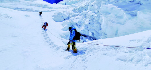 5月9日,陳剛等人從6500米營地前往7028米營地,攀登大冰壁途中。中國地質大學(武漢)供圖