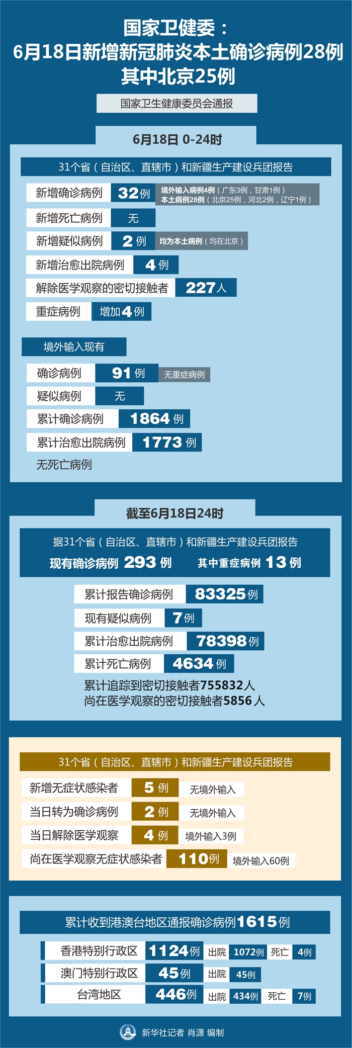 新華社北京6月19日電(記者田曉航)據國家衛生健康委員會19日通報,6月18日0-24時,31個省(自治區、直轄市)和新疆生產建設兵團報告新增新冠肺炎確診病例32例,其中境外輸入病例4例(廣東3例,甘肅1例),本土病例28例(北京25例,河北2例,遼寧1例);無新增死亡病例;新增疑似病例2例,均為本土病例(均在北京)。
