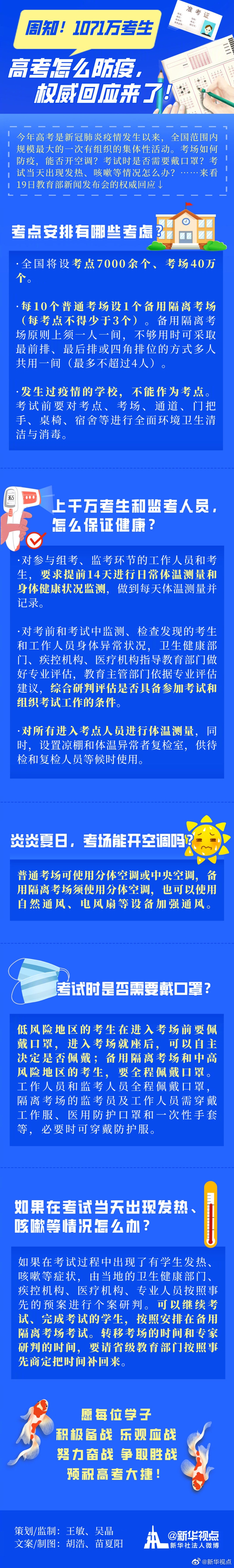 半個(gè)多月以后的7月7日和8日,1071萬考生將迎來人生當(dāng)中的一次大考。今年高考是新冠肺炎疫情發(fā)生以來,全國范圍內(nèi)規(guī)模最大的一次有組織的集體性活動(dòng)。考場如何防疫,能否開空調(diào)?考試時(shí)是否需要戴口罩?考試當(dāng)天出現(xiàn)發(fā)熱、咳嗽等情況怎么辦?……來看19日教育部新聞發(fā)布會(huì)的權(quán)威回應(yīng)↓