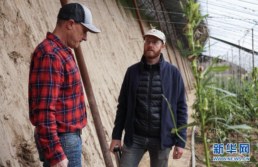 摩根(左)和丹尼爾在西寧市總寨塬高原型現(xiàn)代都市農(nóng)業(yè)科技示范園的蔬菜大棚內(nèi)聊天(2019年11月12日攝)。新華社記者吳剛攝