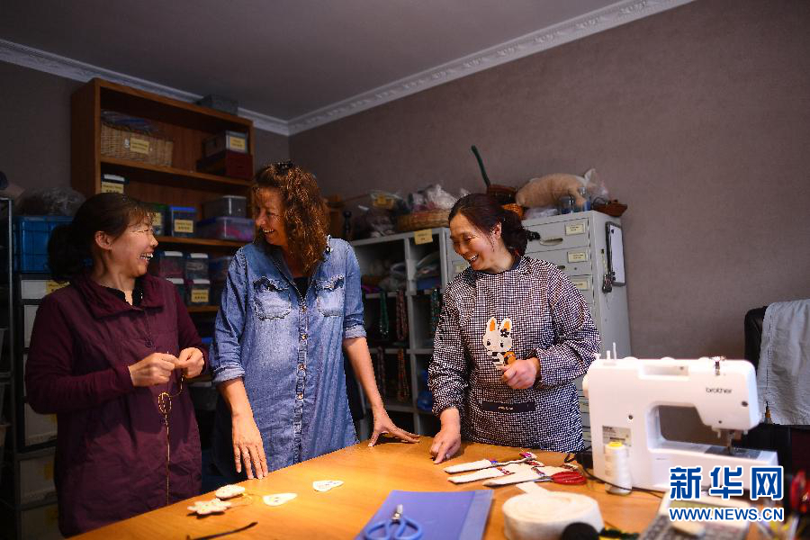 在青海省西寧市,安鵬的妻子(中)在自己的手工藝工作室內(nèi)和手工藝人交談(2019年4月19日攝)。新華社記者張宏祥攝
