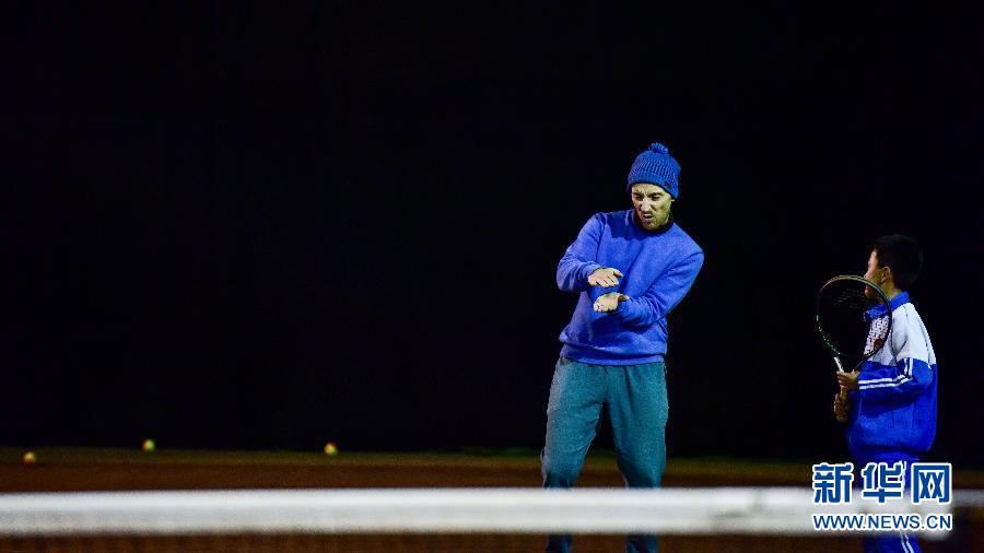 在青海省海東市互助土族自治縣的網(wǎng)球場內(nèi),喬西·羅賓遜(左)在指導學員發(fā)球(2019年11月7日攝)。新華社記者吳剛攝