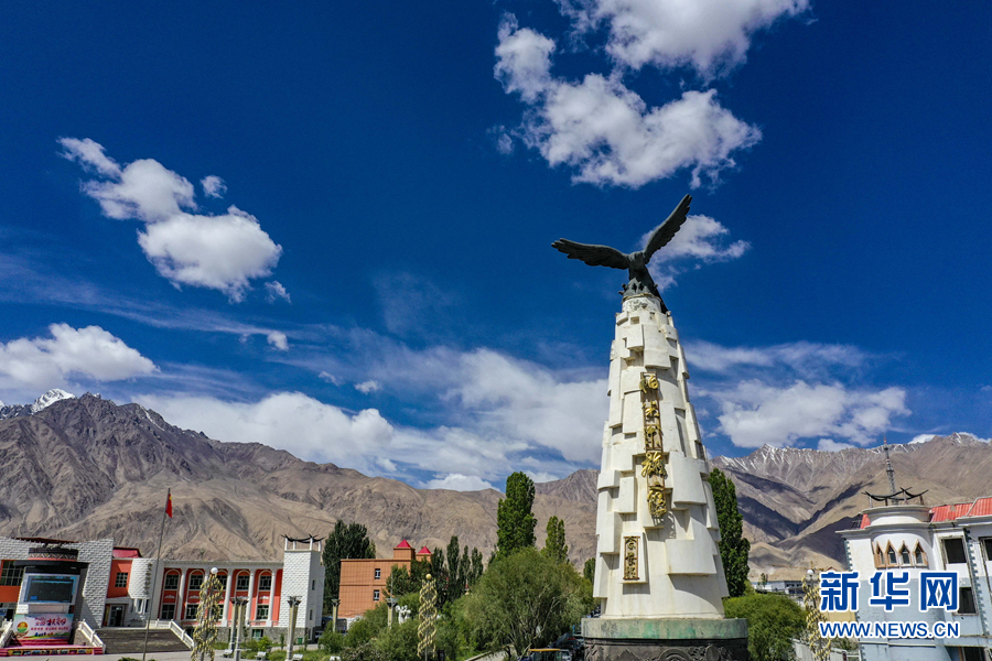 這是位于新疆塔什庫爾干塔吉克自治縣縣城的“帕米爾雄鷹”雕塑(6月20日攝,無人機照片)。新華社記者 胡虎虎 攝