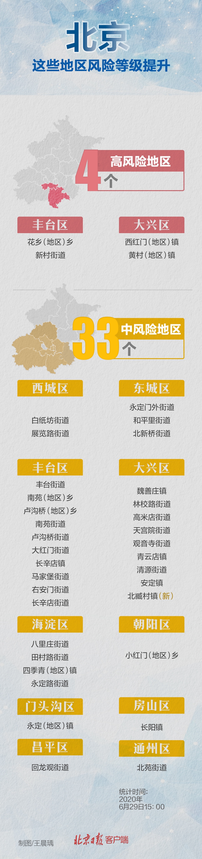 截至目前,本市已有33個中風險地區,涉及豐臺區、大興區、海淀區、西城區、房山區、東城區、朝陽區、門頭溝區、通州區、昌平區10個區。另有4個高風險地區,分別位于豐臺區、大興區。
