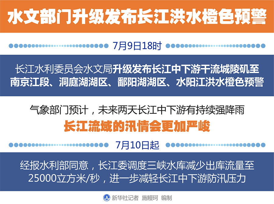 新華社武漢7月9日電(記者李思遠(yuǎn)、樂文婉)長江水利委員會(huì)水文局9日18時(shí)升級發(fā)布長江中下游干流城陵磯至南京江段、洞庭湖湖區(qū)、鄱陽湖湖區(qū)、水陽江洪水橙色預(yù)警。水文部門提醒,有關(guān)單位和公眾務(wù)必注意防范日益嚴(yán)峻的汛情。
