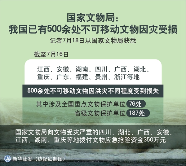 新華社北京7月18日電(記者施雨岑)記者18日從國家文物局獲悉,截至7月16日,江西、安徽、湖南、四川、廣西、湖北、重慶、廣東、福建、貴州、浙江等地500余處不可移動文物因洪災(zāi)不同程度受到損失,其中涉及全國重點文物保護單位76處、省級文物保護單位187處。