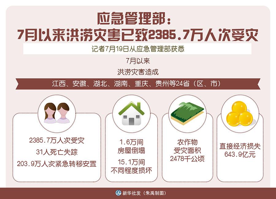 據(jù)應(yīng)急管理部統(tǒng)計(jì),7月以來,洪澇災(zāi)害已造成1.6萬間房屋倒塌,15.1萬間不同程度損壞;農(nóng)作物受災(zāi)面積2478千公頃;直接經(jīng)濟(jì)損失643.9億元。與近5年同期均值相比,緊急轉(zhuǎn)移安置人次上升53.6%,因?yàn)?zāi)死亡失蹤人數(shù)、倒塌房屋數(shù)量和直接經(jīng)濟(jì)損失分別下降82%、78.3%、5.9%。