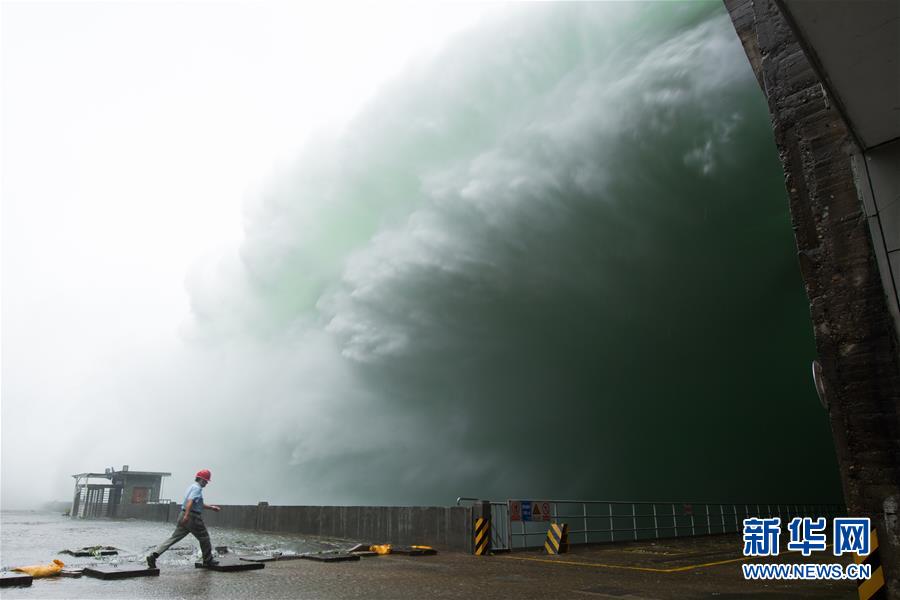 新安江電廠工作人員從正在泄洪的新安江水庫壩底經過(7月7日攝)。 新華社記者 翁忻旸 攝