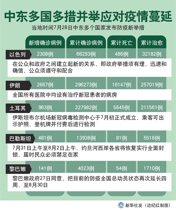 新華社突尼斯7月29日電 綜合新華社駐中東地區記者報道:為進一步應對中東多國持續蔓延的新冠疫情,同時防止因宰牲節人群聚集加劇疫情擴散,中東多個國家28日發布防疫新舉措。
