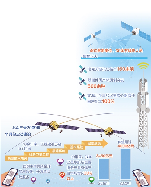 “北斗三號2009年11月份啟動建設。10余年來,工程建設歷經關鍵技術攻關、試驗衛星工程、最簡系統、基本系統、完整系統5個階段,提前半年完成全球星座部署,開通全系統服務。建成即開通、開通即服務,工程建設取得了巨大成就。”冉承其說。