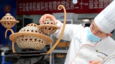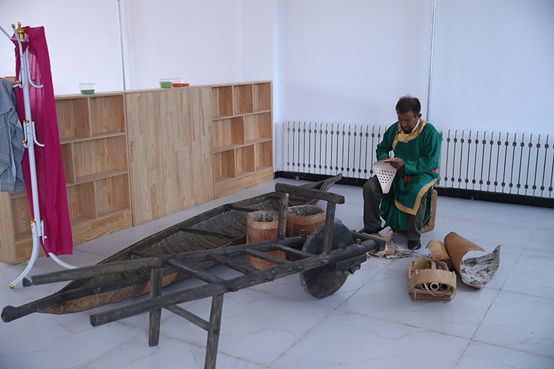 在獵民村手工藝工坊記者見到年輕時(shí)打過獵、扎過撮羅子(狩獵和游牧民族的一種圓錐形“房子”)的那春林,他正在用樺樹皮制作蟈蟈籠子。鄂溫克人會(huì)在籠子里放上蟈蟈,把蟈蟈當(dāng)作魚餌帶到阿倫河釣細(xì)鱗魚。他身旁的樺樹皮船、儲(chǔ)物筒、刀具配件都是用樺樹皮制作的。那春林說今年已接到一批展品訂單,預(yù)計(jì)可以收入4萬(wàn)塊錢,家里流轉(zhuǎn)的土地還可以為他帶來3萬(wàn)多元收入。
