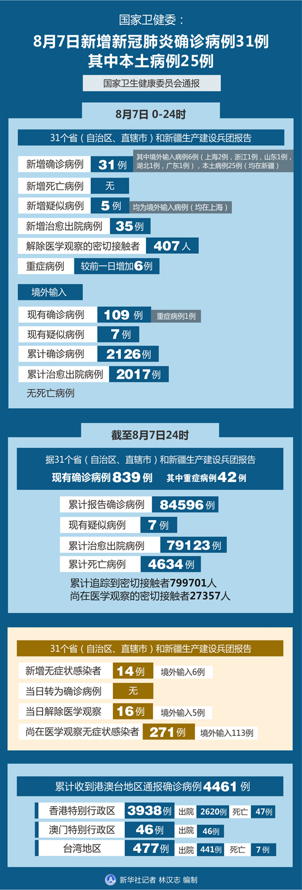 新華社北京8月8日電 國家衛生健康委員會8日通報,8月7日0—24時,31個省(自治區、直轄市)和新疆生產建設兵團報告新增新冠肺炎確診病例31例,其中境外輸入病例6例(上海2例,浙江1例,山東1例,湖北1例,廣東1例),本土病例25例(均在新疆);無新增死亡病例;新增疑似病例5例,均為境外輸入病例(均在上海)。