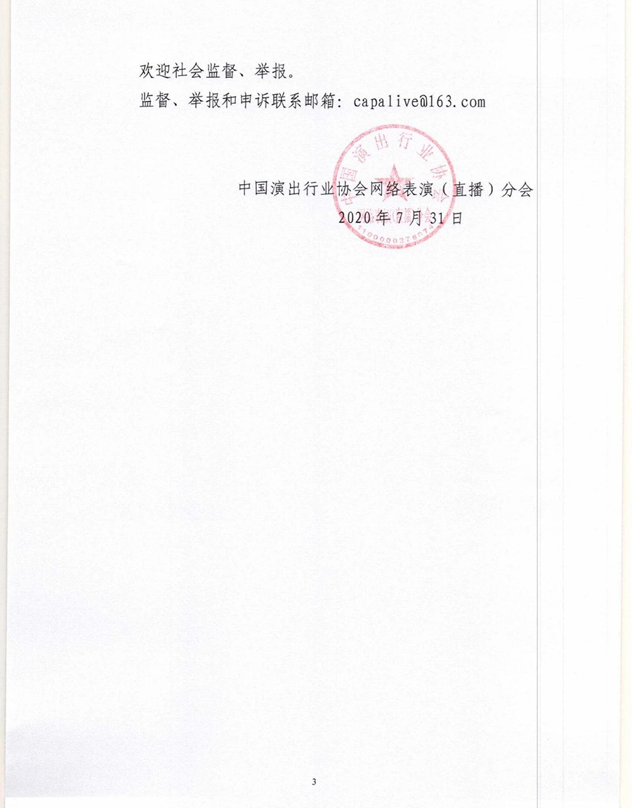 中國演出行業協會網絡表演(直播)分會8月9日發布: