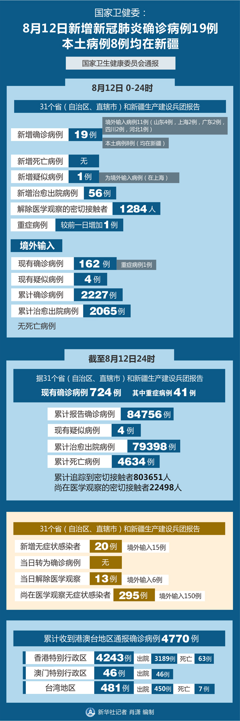 新華社北京8月13日電 國家衛健委13日通報,8月12日0—24時,31個省(自治區、直轄市)和新疆生產建設兵團報告新增確診病例19例,其中境外輸入病例11例(山東4例,上海2例,廣東2例,四川2例,河北1例),本土病例8例(均在新疆);無新增死亡病例;新增疑似病例1例,為境外輸入病例(在上海)。