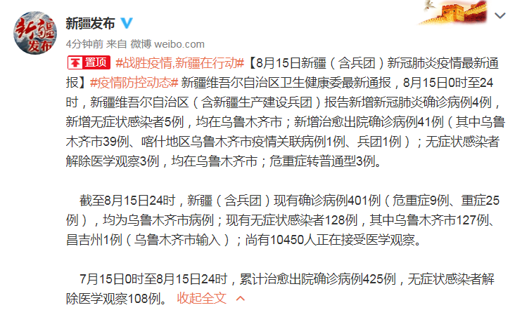 截至8月15日24時,新疆(含兵團)現(xiàn)有確診病例401例(危重癥9例、重癥25例),均為烏魯木齊市病例;現(xiàn)有無癥狀感染者128例,其中烏魯木齊市127例、昌吉州1例(烏魯木齊市輸入);尚有10450人正在接受醫(yī)學觀察。