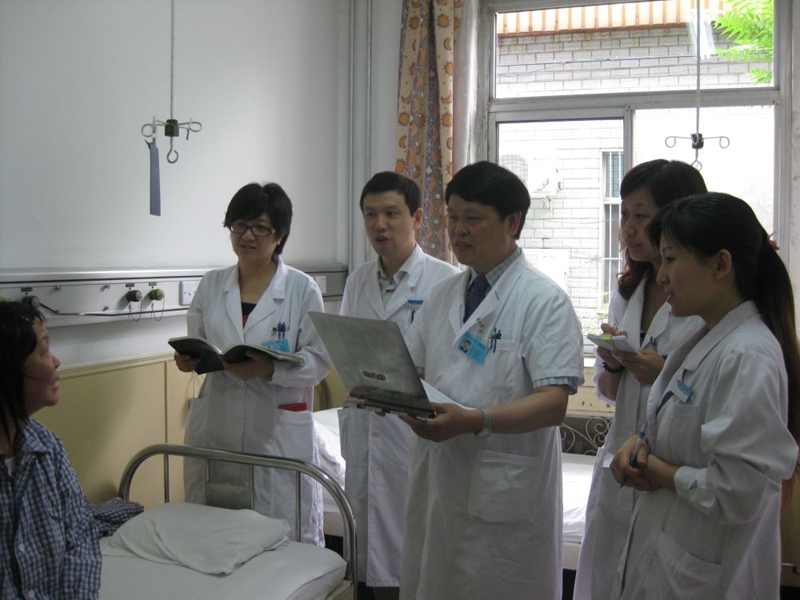 中國醫學科學院腫瘤醫院徐兵河教授(右三)、馬飛教授(右四)攜治療團隊在病房查問乳腺癌患者康復情況。圖片由受訪者提供