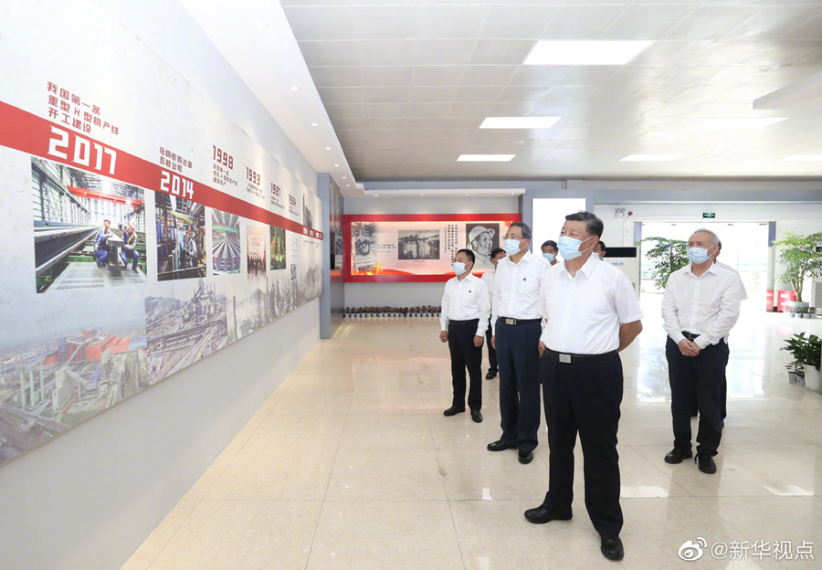 19日上午,正在安徽考察調(diào)研的習(xí)近平總書記走進(jìn)中國(guó)寶武馬鋼集團(tuán)優(yōu)質(zhì)合金棒材車間,冒著高溫察看生產(chǎn)運(yùn)行情況,并同勞動(dòng)模范、工人代表親切交流。習(xí)近平指出,在抗擊新冠肺炎疫情過(guò)程中,馬鋼較早復(fù)工復(fù)產(chǎn),實(shí)現(xiàn)了產(chǎn)量、營(yíng)銷收入同比雙升,展現(xiàn)了國(guó)有經(jīng)濟(jì)的強(qiáng)大韌性。他勉勵(lì)馬鋼在長(zhǎng)三角一體化發(fā)展中把握機(jī)遇、順勢(shì)而上,特別是要把自身改革發(fā)展同長(zhǎng)三角一體化發(fā)展有機(jī)結(jié)合銜接,力爭(zhēng)在長(zhǎng)三角一體化發(fā)展中不斷發(fā)展壯大自己,也為長(zhǎng)三角一體化發(fā)展作出自己的貢獻(xiàn)。(文字記者:張曉松 攝影記者:鞠鵬 王曄 燕雁)